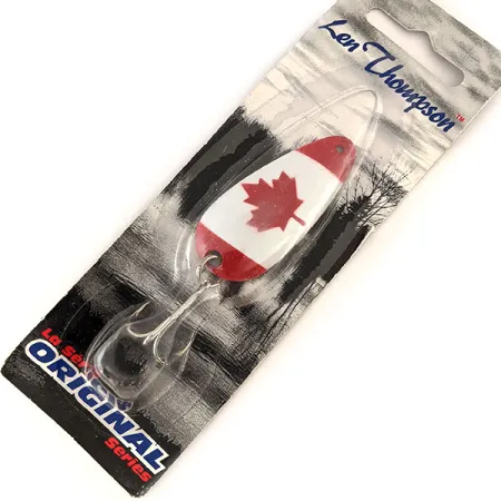 Featuring a bold red and white Canadian flag pattern with a central maple leaf, this spoon reflects the heritage of its Lacombe, Alberta manufacturing. At 1/2 oz (14 g) and a length of 2" (5 cm), the #00 size serves as a versatile tool for casting or trolling applications. This specimen, tracked under product code 11192, is unused and remains in its original carded packaging. The Thompson-Pallister Bait Co. Ltd. has produced these lures since 1929, prioritizing a balanced design that facilitates a consistent slow wobbling action. A silver-tone treble hook is mounted to the base, maintaining the quality standards associated with the Original Series. The reverse of the packaging provides a brief history of the company’s beginnings in Abernethy, Saskatchewan, highlighting nearly a century of production in Western Canada.