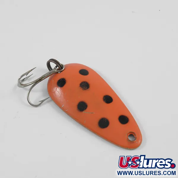 Adorned with a bold pattern of six black dots over a vibrant orange-red finish, this Canadian-made spoon carries the legacy of a design that has been a tackle box staple since 1929. Weighing in at 1/2 oz (14 g), the teardrop-shaped brass body measures 2" (5.0 cm) in length, making it a versatile choice for both casting and trolling. The back of the lure features the classic deep-stamp hallmark of the manufacturer, identifying it as a Len Thompson #00 model. Its paint finish remains remarkably crisp, and with a condition rating of 4/5, the piece shows only light signs of handling while maintaining a bright, reflective brass surface on the reverse. It comes equipped with a sturdy split ring and an original treble hook, intended to leverage the slow wobbling action that characterizes this specific baitfish mimic. Collectors will recognize the distinct hardware and stamping associated with product code 2579.