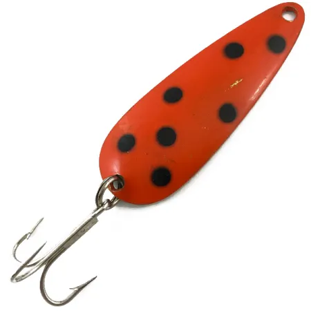 Vibrant orange-red paint with bold black dots covers the face of this 3 1/4" (8cm) Len Thompson #2 spoon. Stamped clearly on the brass-finished backside is the maker's name, a mark of Canadian quality that collectors have recognized since production began in 1929. Carrying a weight of 1oz (28g), this specimen, identified by product code 4652, features a teardrop shape engineered for a slow wobbling movement intended to mimic baitfish. The original treble hook is attached via a sturdy split ring at the base, and the top is punched for a direct line tie or additional hardware. Rated at a 4/5 condition, the front surface shows some light character marks and small chips in the enamel from previous use, while the brass reverse exhibits a few darkened oxidation spots. This heavy casting spoon remains a quintessential piece of fishing history, designed for targeting pike, lake trout, and salmon in deep or moving water.