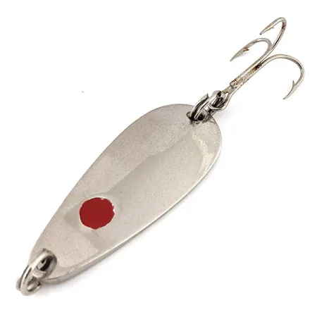 Featuring a classic red dot centered on its polished nickel body, this spoon reflects the long-standing craftsmanship associated with the USA-made Les Davis line under Luhr Jensen. Stamped on the reverse with the 'HOTROD' moniker and a 3/8 oz mark, the official weight for this 14031 specimen is recorded as 2/5 oz (11 g). The lure measures 2" (5 cm) and maintains a bright, clean finish that highlights its smooth teardrop profile. Equipped with original split rings and a treble hook, the hardware shows no signs of wear, earning a solid 5/5 condition rating. The red accent provides a distinct focal point against the high-luster nickel plating, a design choice often favored for light-catching visibility in the water.