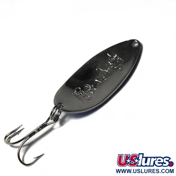 White pearl fading into a vibrant blue makes this specific finish stand out in any tackle box. Tipping the scales at 1/2 oz (14 g), this 2 1/4" (5.5 cm) Seneca Little Cleo (Hula Girl) carries the iconic dancer emblem stamped on the reverse, a detail that purists know was lost after the brand moved to Acme in the early '80s. Collectors often hunt for these original Seneca pieces because of that 'Hula Girl' legend, believing the stamped figure added a bit of extra luck on the water. This specimen, assigned product code 0274, remains in excellent 5/5 condition, showing off its crisp USA-made craftsmanship and original hardware. The spoon’s distinctive shape and weight are designed for casting or trolling, paired here with a sharp treble hook secured by a sturdy split ring. Each curve of the polished metal body reflects light through the pearlescent paint, maintaining the high quality expected from a vintage New York-made Seneca lure.