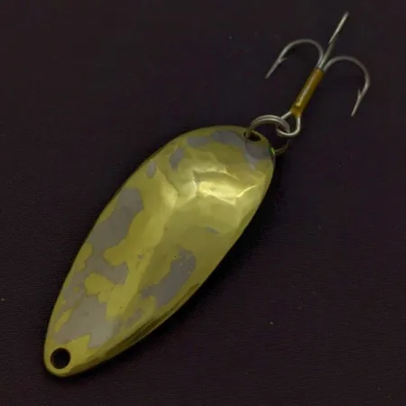 Stamped clearly into the back side of this 1/2 oz (14 g) spoon is the silhouette of an exotic dancer, the hallmark of an original Seneca-era production. This specific specimen, listed under Product Code 24364, features the iconic Nickel/gold two-tone finish and the classic hammered texture on the face. Measuring 2 1/4" (5.5 cm), the teardrop-shaped body is paired with a sturdy treble hook attached via a standard split ring. The historical engraving of the 'Hula Girl' was inspired by Seneca founder Charlie Clark’s fascination with a performer's movement, a design element that was eventually phased out after Acme acquired the company in the 1980s. Its heavy metal construction is purpose-built for casting into deeper water columns where the dual-tone finish provides high-contrast light reflection. The surfaces show a well-preserved finish with some minor age visible, earning this piece a condition rating of 4/5. Authentic 'Wig-L-Lure' text remains legible near the line-tie hole, confirming its New York manufacturing roots.