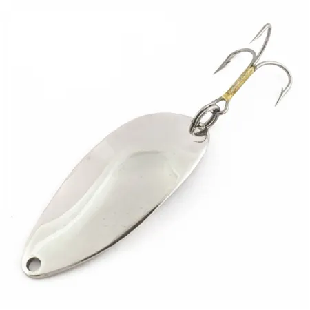 Stamped with the distinctive dancer image on the reverse, this nickel-plated spoon represents the original design from the Seneca Lure Co. era. Weighing 1/2 oz (14 g), the heavy metal body is shaped with the characteristic wide profile intended for long casting. The bright nickel finish covers the 2 1/4" (5.5 cm) frame, which features the "LITTLE CLEO" and "SENECA LURE CO." markings clearly visible on the back. Anglers often look for this specific Hula Girl detail which was phased out after Acme acquired the company in the early 1980s. This specimen, identified by Product Code 24590, shows a clean surface with a condition rating of 5/5. The hardware consists of a single treble hook attached to the rear eyelet.