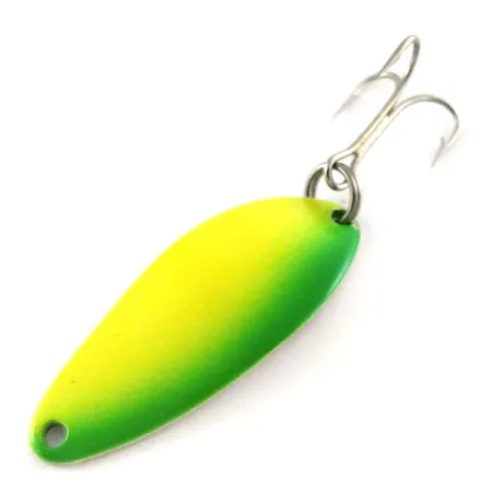 A weight of 1/4oz (7g) defines this vintage spoon's profile for the light-tackle enthusiast. Measuring 1 1/2" (4cm) in length, the Little Cleo Seneca is finished in a vibrant yellow and green gradient that transitions into a bright glow-in-the-dark effect for deep water or dusk sessions. Identified by product code 15714, this lure was manufactured in the USA by Seneca Lure before the brand was integrated into Acme’s catalog in the early 1980s. This particular example remains unused, earning a condition rating of 5/5. The construction features the original split ring and high-quality treble hook, maintaining the technical integrity of the design that Seneca pioneered before the brand's acquisition.