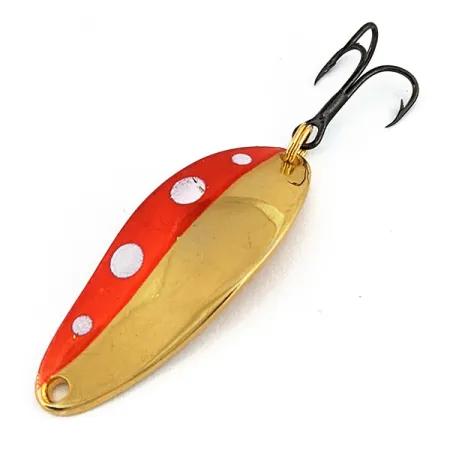 Five crisp white polka dots against a vibrant red backdrop characterize the upper diagonal section of this 1 1/2" (4 cm) spoon. Weighing in at 1/4 oz (7 g), this classic casting specimen is a genuine vintage artifact from Seneca Lure, manufactured in the USA before the brand's acquisition by Acme in the early 1980s. The high-polish gold finish on the lower half provides a sharp visual contrast to the painted section, while the reverse side features the distinct stamped inscription: "LITTLE CLEO WIGL-LURE SENECA LURE." Equipped with a robust split ring and a black-finished treble hook, this lure, identified by product code 15964, appears unused and is rated in 5/5 condition. The teardrop profile and stamped brass construction represent the original design specifications that made the Seneca-produced Little Cleo a staple in many legacy tackle boxes.