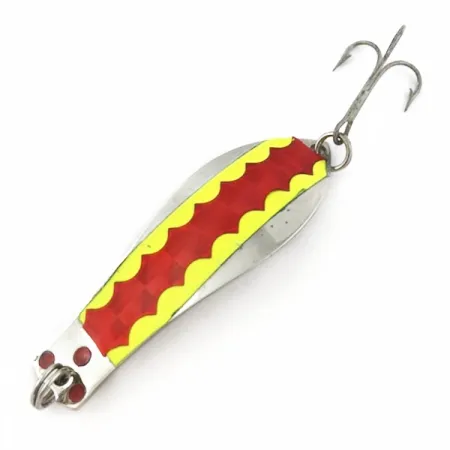 A vibrant yellow and red scalloped sticker with a diamond-like reflective texture defines the visual profile of this 2 1/2" (6.5cm) spoon. Weighing 1/3oz (10g), the Prescott Spinner "Little Doctor 265" is constructed from a polished nickel blank, showcasing the classic American manufacturing from its USA origin. Three distinct red dots are positioned near the lower split ring, providing a small cluster of color where the line attaches to the wide base. On the opposite, narrower end, a treble hook is mounted via a sturdy ring. The reverse side of the lure is finished in clean, plain nickel, emphasizing the functional metalwork of this vintage design. Rated at 5/5, this specimen (Product Code 23977) is remarkably well-preserved, with the decorative elements and metallic finish remaining bright and intact.