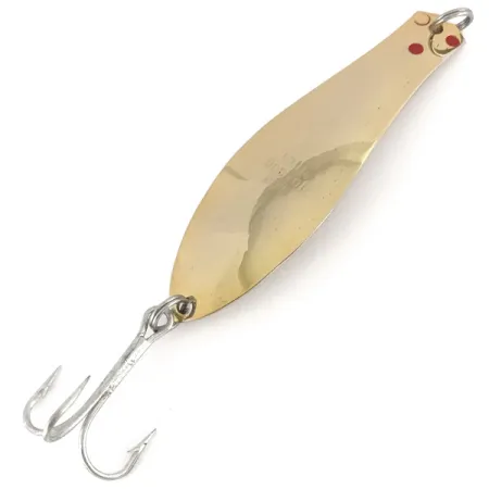 Polished gold plating covers the wide surface of this USA-manufactured spoon, providing a high-visibility profile for casting or trolling. Catalogued under product code 7792, this Prescott Spinner Little Doctor 275 measures 3 1/2" (9cm) and weighs 3/4oz (21g). Three distinctive red paint dots are found on the inner concave side near the line tie, serving as a subtle visual trigger often associated with the series. The metal is stamped with the model name and manufacturer on this interior face, indicating its classic production roots. Reliable split rings secure the hardware at both ends, supporting a clean treble hook that shows no signs of aging. This specimen maintains an excellent appearance, justifying a condition rating of 5/5.