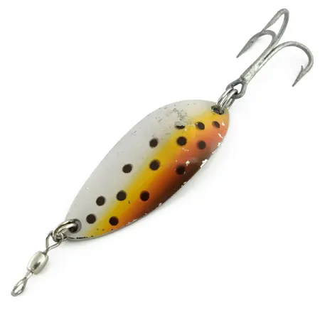 Tipping the scales at 1/2 oz (14 g), this classic spoon features a distinct Trout pattern over a polished nickel base. Measuring 2 1/4" (5.5 cm) in length, the metal body is stamped on the reverse with the "LITTLE JEWEL" name, the Luhr Jensen branding, and its USA origin alongside a visual 2/5 oz weight mark. Minor paint loss and surface aging on the face of the spoon represent its status as a 4/5 condition piece. The Trout colorway transitions from silver to a warm orange-yellow hue, punctuated by dark spotting to mimic natural salmonids. This specific specimen, identified by product code 8733, is a vintage model that has not been produced for many years. For rigging, a barrel swivel is attached to the nose, while a sharp treble hook is secured to the tail by a split ring.