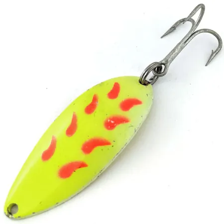 Weighing 3/4 oz (21 g), this vintage specimen features a classic yellow base decorated with several red teardrop patterns along the side. Measuring 2 1/2" (6.5 cm), the Little Jewel UV is a discontinued model from Luhr Jensen's USA production era. Under ultraviolet light, the finish transforms, with the yellow paint glowing a neon green while the red accents shift to a high-visibility orange. The lure's construction relies on a teardrop-shaped metal body paired with a stout treble hook and a secure split ring at the rear. Product code 13541 identifies this particular spoon, which is held in 5/5 condition, showing a clean surface and sharp points on the hardware. It was designed primarily for casting and trolling, where its weight allows for reaching specific depths in the water column. The UV properties were a notable innovation for Luhr Jensen, intended to increase visibility for predatory fish in darker or deeper environments.