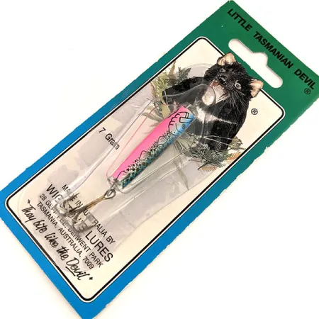 Weighing in at 1/4oz (7g), this Little Tasmanian Devil is a classic Australian-made lure designed by Wigston's Lures for a variety of casting and trolling applications. The 1 1/2" (4cm) winged body is finished in the vibrant Rainbow Trout pattern, featuring a bright pink top section that transitions into a blue and silver scale pattern with fine black spots. Being an unused specimen (Condition 6), it remains secured in its original blue and white blister pack, complete with the iconic "They bite like the Devil" tagline and the 28 Gepp Parade address from its Tasmanian origins. On the reverse side, the packaging provides detailed rigging instructions for attaching a snap swivel or feeding a line directly through the lure body to a hook and bead. This particular piece is cataloged under product code 11568 and features the traditional winged shape associated with the brand since its inception.