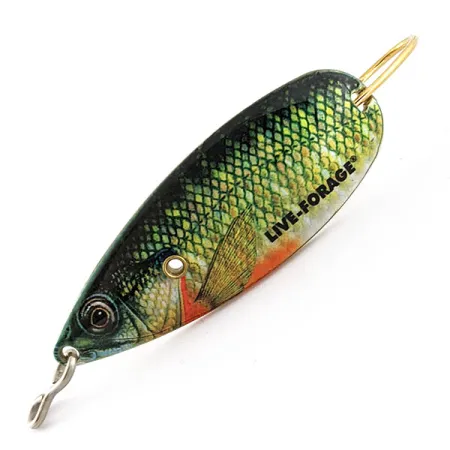 Rainbow fish scale patterns are rendered in high-definition holographic detail across the surface of this Northland spoon. Identified by product code 21249, the lure measures 2 3/4" (7 cm) and weighs a substantial 3/4 oz (21 g), allowing for precise placement in the water column. Its single gold-finish hook is protected by a sleek wire weed guard designed to slip through lily pads and brush without snagging. The anatomical artwork includes a vivid pectoral fin and a focused eye, enhancing the lure's resemblance to actual forage. Made in the USA, the piece is in 5/5 condition, showing no signs of use while preserving the metallic depth of its finish. The brand name "LIVE-FORAGE" is stamped cleanly along the upper edge, and a small metal line-tie is secured at the nose. The underside of the metal body reveals a polished gold surface that provides a contrasting flash.