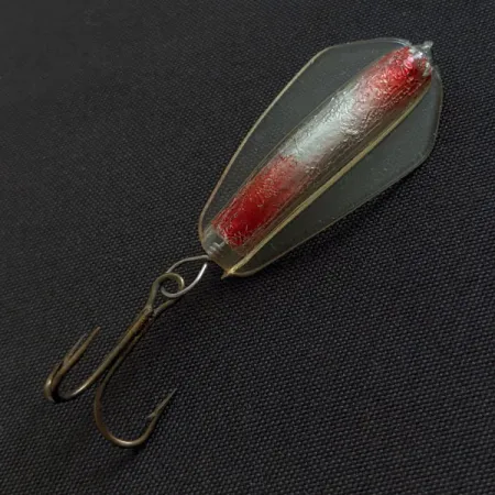 Silver and red pigments are encased within the clear, winged body of this 3/16oz (5g) casting lure. Identified as a Lofty's Cobra under Product Code 18865, this 1 1/4" (3cm) specimen showcases the distinct "boat-shaped" design that allows it to reach depths of 6ft (1.8m) when trolled. The internal silver core is accented by vibrant red tips, protected by a durable transparent plastic shell. Its hardware features a clean double hook attached to a through-wire system, which is characteristic of this model's rugged construction for targeting trout, salmon, or bass. In terms of condition, this piece sits at a 5/5, with the exterior shell and internal colors appearing exceptionally well-preserved and clear. The wire loops remain tight and unmarred, reflecting the physical state of this particular vintage find.