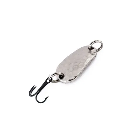 Measuring exactly 1" (2.5 cm) in length, this compact spoon exemplifies the classic American craftsmanship associated with the Luhr Jensen brand. The Hammered Steel finish provides a multi-faceted surface that reflects light from various angles, a design choice often favored for light-sensitive fishing conditions. Weighing 3/16 oz (5 g), the lure is well-suited for ultralight spinning tackle or vertical jigging applications where a small profile is required. This specific specimen, cataloged under product code 11747, remains in excellent 5/5 condition, retaining the integrity of its original plating and metalwork. The hardware includes a sharp black-finished treble hook and heavy-duty split rings at both ends for secure rigging. Manufactured in the USA, the solid metal construction provides a substantial feel despite its diminutive size.