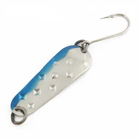 Stamped with a series of raised diamond-shaped facets across the blade, the surface of the Luhr Jensen Alpena Diamond provides a multi-directional texture for light reflection. A vibrant blue paint accent runs along one edge of the nickel-plated 1 3/4" (4.5 cm) spoon, while the reverse side features a uniform metallic finish. Weighing 1/8 oz (4 g), the compact body is suited for light-line casting or trolling applications. This specimen, identified by product code 24617, remains in 5/5 condition with the finish and paint showing very little evidence of previous use. A single hook is mounted to the rear to maintain a streamlined profile.