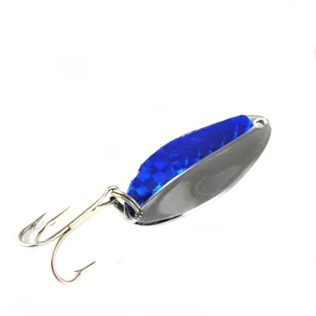 A striking blue prismatic scale pattern covers half of the polished nickel body on this vintage American-made spoon. Produced by TODDCO under the model name Main Liner (Product Code 0395), the lure reflects a period of durable, high-quality manufacturing in the USA. Measuring 2" (5 cm) and weighing a versatile 2/5 oz (11g), the teardrop-shaped metal body is designed for balanced casting and trolling. The nickel finish is remarkably bright, providing a high-contrast backdrop for the textured blue insert that wraps around the outer curve. Hardware includes a strong, silver-finished treble hook secured by a standard split ring at the tail. This particular specimen is exceptionally well-preserved, showing no signs of wear and earning a condition rating of 5/5. The line-tie eyelet at the narrow end remains clean and perfectly circular, typical of the precision machining from this era of tackle production.