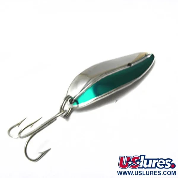 A striking teal-green reflective finish defines one side of this spoon, contrasting beautifully against the polished nickel-plated body. Weighing in at 2/5oz (11g) and measuring 2" (5cm) in length, this TODDCO Main liner is a classic piece of American craftsmanship from the USA. The metal blank features a distinct longitudinal ridge stamped down the center, a structural detail common in mid-century casting spoons to provide rigidity. This specific specimen, cataloged under product code 0454, remains in beautiful condition with a rating of 5/5, showing a bright, clean surface on both the nickel and the colored flash. The hardware consists of a single, sharp treble hook secured by a heavy-duty split ring, ready for use or display. A small line-tie hole is cleanly drilled at the head, maintaining the streamlined profile of the Nickel / Green color scheme.