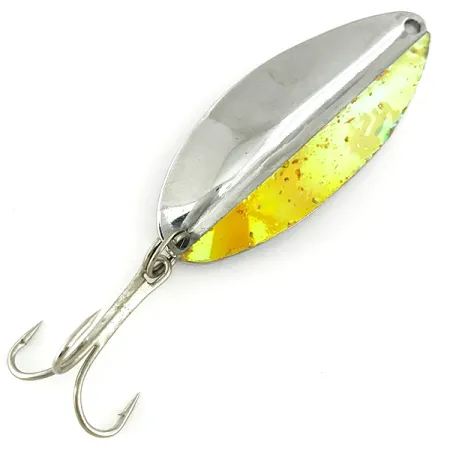 Split lengthwise into two distinct halves, this 2 1/4" (5.5 cm) spoon showcases a classic Nickel / Nickel / Orange color scheme. One side features a high-polish nickel finish for maximum flash, while the other is treated with a vibrant orange-yellow scale pattern that displays strong reactivity under UV light. Produced by the American company TODDCO until 1980, the Main liner is a staple of mid-century tackle design from the USA. This specimen, identified by product code 6877, is in 5/5 condition, showing remarkably clean surfaces and well-preserved hardware. The lure is equipped with a classic treble hook and a thick split ring, weighted at 2/5 oz (12.5 g) for effective casting.