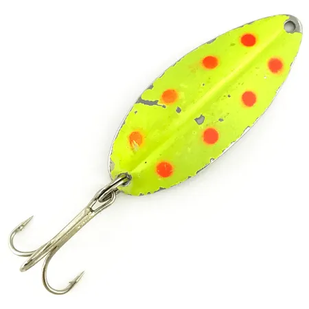 Measuring 2 1/4" (5.5 cm) in length, the stamped metal body of this TODDCO creation features a distinctive central ridge that defines its elongated oval silhouette. This Main liner UV, cataloged under product code 6878, represents American tackle manufacturing from the era ending in 1980. The finish consists of a vibrant yellow fluorescent paint decorated with bright red spots over a solid nickel base. When subjected to UV light, the yellow pigment transitions into a vivid neon green glow, while the red circular accents remain dark for high-contrast visibility. Rated at a 4/5 condition, the specimen shows honest signs of use with minor paint loss along the edges and the raised center line, revealing the polished nickel substrate. It carries a weight of 2/5 oz (12.5 g), balanced for traditional casting or trolling techniques. The hardware setup includes a sharp treble hook secured by a split ring at the tail and a clean attachment eyelet at the nose.