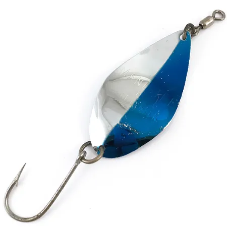 Measuring 3" (7.5cm) in length, the teardrop profile of this spoon is a hallmark of the early American tackle industry. The Manistee 4, identified by product code 4881, showcases a striking Nickel / Blue finish on its convex side, while the back remains a clean, reflective nickel. Stamped clearly into the metal is the Luhr Jensen name and model, a signature of the brand's production in the USA before its acquisition by Rapala. Weighing in at 1/2oz (14g), the lure is built for durability with a heavy-gauge single hook and an integrated barrel swivel at the line tie. The overall condition is a solid 4/5, with the original nickel plating retaining its bright luster across both surfaces. This specimen represents a discontinued era of manufacturing, favored by anglers targeting salmon and trout in deep-water environments.