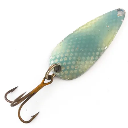 A distinctive light blue honeycomb scale pattern covers the convex side of this classic spoon, a signature look from the Marathon Bait Company. Measuring 1 3/4" (4.5cm) and weighing 3/16oz (5.5g), this mid-century specimen represents the height of Wisconsin's lure manufacturing history. Turning the lure over reveals a clean nickel-plated finish stamped with the "MARATHON" name in an elegant arc, identifying it as product code 4161. The company operated out of Wausau, Wisconsin, from 1929 to 1979, and pieces like this show why they remained a staple for fifty years. Hardware includes a solid split ring attached to a vintage treble hook that shows light signs of its age. The condition is rated 4/5, maintaining most of its original paint and reflective surface. It was designed for light casting or trolling, where the spoon’s teardrop shape and weight distribution allowed it to stay deep in the water column.