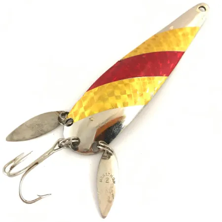 Two small, elongated sonic blades are attached via split rings near the tail of this 3 3/4" (9.5cm) spoon, a signature design element from the Marathon Bait Company. Bearing the product code 4700, this specimen weighs in at 3/5oz (17g) and features a bright nickel finish on its backside. The convex side is layered with a textured prismatic tape showcasing alternating diagonal bands of gold and red. Produced by the Wisconsin-based manufacturer that operated from 1929 to 1979, the lure is designed so the secondary blades add visual depth near the treble hook. This specific piece is in well-preserved condition, earning a 4/5 rating with clear stampings still visible on the metal. The underside of the spoon body is stamped with the Marathon name and a size indicator, matching the branding found on the individual sonic blades.