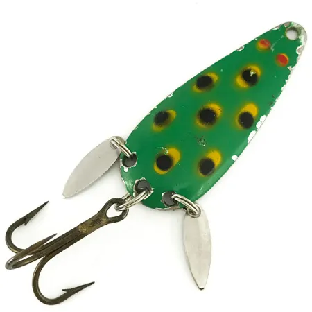 Green and yellow spots in a traditional frog pattern decorate the top surface of this 2 1/4" (6cm) spoon. Stamped clearly on the polished nickel underside is the name Marathon, a manufacturer that defined the Wisconsin tackle scene from their Wausau base between 1929 and 1979. At the tail of this 2/5oz (12g) specimen, identified by product code 7156, two distinctive silver-colored sonic blades are mounted on the split ring. These elongated mini-blades are positioned to reflect light and obscure the dark-finished treble hook while the lure is cast or trolled. This specimen presents in clean condition with minimal enamel wear, meriting a 5/5 rating.