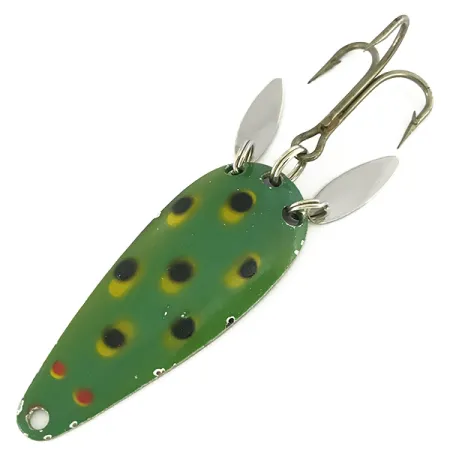 Vibrant Frog patterning consisting of bold black and yellow spots over a green base defines the face of this 2/5 oz (12 g) casting spoon. Identified by product code 7175, this specimen features two small, silver-finished "sonic blades" attached via split rings near the treble hook. These specialized teardrop blades are designed to offer visual flash and vibration while partially masking the terminal hardware. The lure measures 2 1/4" (6 cm) in length and carries a polished nickel finish on its reverse side, where the Marathon brand name is stamped into the metal. Produced by the Marathon Bait Company, a Wisconsin manufacturing giant from 1929 to 1979, this lure remains in 4/5 condition, showing well-preserved paint and clean metal surfaces. A simple eyelet at the narrow end provides the connection point for casting or trolling, while the broad, rounded tail holds the split ring for the hook assembly.