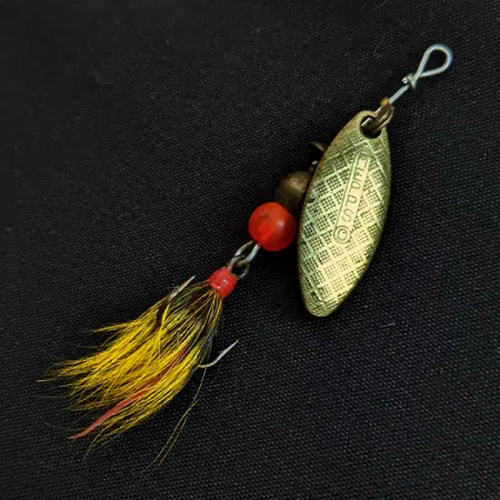 Stamped clearly on the underside of the blade are the words "AGLIA MADE IN FRANCE," a hallmark of the quality Mepps established early on. Product code 17914 designates this specific spinner, which features a textured silver blade measuring approximately 2" (5.1 cm) in total length. The 3/32 oz (2.6 g) weight is centered around a red plastic bead and a solid metal body, providing the necessary mass for casting on ultra-light gear. A hand-dressed treble hook adds a significant visual element, combining yellow and darker natural feathers tied with a vibrant red accent. Its condition is 5/5, with the wire shaft remaining straight and the hardware showing no signs of wear. Components for this lure originated in France and were assembled in the USA, representing a classic era of international tackle production. The top loop is neatly finished, maintaining a secure connection point for fine-diameter fishing lines.