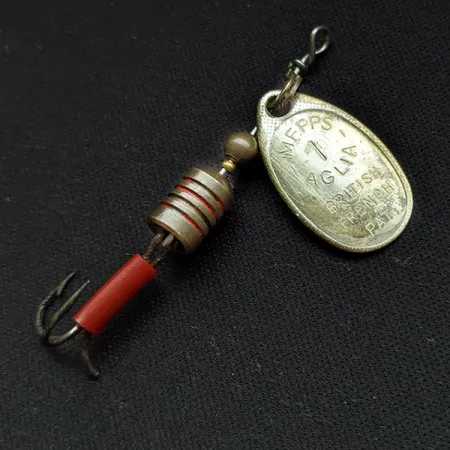 Stamped with the "British French Pat." mark, the silver blade of this specimen highlights the early international reach of André Meulnart’s 1938 invention. Weighing a light 1/8 oz (3.5 g) and measuring 2" (5 cm), the lure features a classic brass body with machined grooves that still retain their original red paint accents. On the reverse side of the blade, the "Made in France" lettering is clearly visible, marking its origin before being assembled for the US market. The treble hook is shielded by a vintage red plastic sleeve, a traditional detail designed to provide a focal point for trout and panfish. This Mepps Aglia 1 (Product Code 17093) remains in a well-preserved 4/5 condition, showing the gentle signs of an experienced lure that has been cared for over the decades. The wire harness is straight and the cone rotation system remains functional, allowing the silver blade to spin freely around the weighted body. Such French-made components are a testament to the manufacturing standards that made the Aglia a foundational piece in modern tackle boxes.
