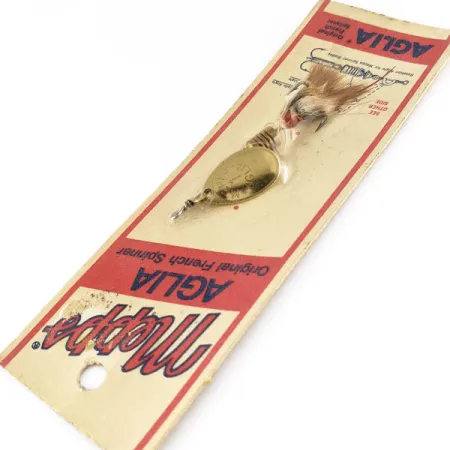 A polished gold-finished blade serves as the centerpiece of this specimen, stamped clearly with the iconic Aglia markings. Weighing in at 1/8 oz (3.5 g) and measuring 2 1/4" (6 cm), this spinner is a classic example of French engineering meeting American distribution. The lure is unused, retaining its original sheen and structural integrity on the vintage red and white Sheldons' Inc. display card. The treble hook is dressed with natural brown hair, featuring the traditional red and white accents often used to target trout and panfish. Identified by product code 17579, the construction includes a stainless steel shaft and a brass body assembly that remains bright. The reverse of the packaging offers a historical window into the Antigo, Wisconsin, company’s offerings, detailing the differences between the Aglia, Comet, and Black Fury models. This specific unit features the French-made blade and the original brass clevis designed for a high-angle rotation when retrieved.