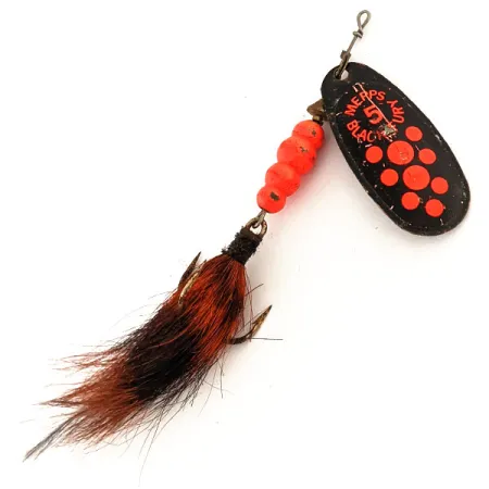 A striking fluorescent red glow emanates from the beads and blade accents under UV light, making this Mepps Aglia 5 Dressed UV highly visible in stained or deep waters. Weighing 1/2 oz (14 g) and measuring 3 1/4" (8 cm), this spinner is built around a heavy central wire featuring a stack of four bright orange beads that provide the necessary weight for long-distance casting. The black-painted blade is stamped with the Mepps Black Fury 5 logo and adorned with seven distinct red dots. This specific specimen, identified by product code 12696, carries a natural hair dressing on the treble hook, utilizing dark squirrel and deer hair with red accents to create a significant underwater profile. While the blade shows a slight deformation from previous use, the lure remains a solid example of French-engineered components assembled in the USA, earning a condition rating of 3/5. The wide blade design relies on a cone-style clevis to facilitate rotation as soon as the retrieve begins, a design hallmark since Andre Meulnart first invented the Aglia in 1938. The contrast between the matte black blade and the UV-reactive red elements offers a specific visual trigger for species like northern pike, trophy bass, and walleye.