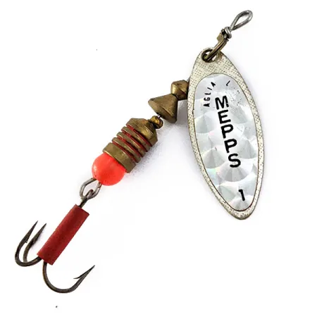 Hammered scale patterns on the silver blade define the look of this 3/16 oz (4.5 g) spinner. Measuring 2 1/4" (6 cm) in length, the lure features a segmented brass body with a central grooved piece highlighted by red paint. A vibrant orange bead sits at the base of the shaft, leading to a treble hook equipped with a protective red sleeve. Stamped with the "AGLIA 1" marking, this specimen carries product code 16933 and was assembled in the USA using high-quality French components. The condition of this specific piece is 5/5, showing clear, bright metal finishes and sharp hook points. Each component, from the clevis to the wire wrap, reflects the durable construction Mepps is known for.
