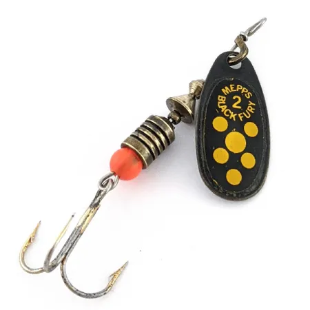 Yellow dots set against a deep black background identify the distinctive blade of this specimen, which bears the product code 22895. Weighing in at 3/16 oz (4.5 g) and measuring 2 1/4" (6 cm) in length, this Mepps Black Fury 2 features a blade stamped with 'COMET 2' and 'MADE IN FRANCE' on the reverse side. The assembly, completed in the USA, pairs the dark blade with a brass-toned segmented body and a vibrant orange bead. This bead provides a sharp contrast right above the original treble hook. The lure is in a solid 4/5 condition, showing the light, honest character expected from a vintage spinner that has been stored carefully. The gold lettering on the blade face remains legible, clearly marking the brand and model.