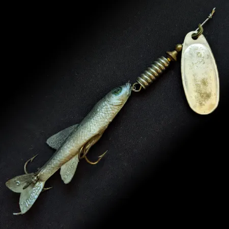 Originating from France and assembled in the USA, this specimen showcases the classic craftsmanship of mid-century production. The silver-finished blade is stamped with the manufacturer's logo and origin markings, identifying it as a 1960s-era Mepps Comet 4 Mino (Product Code 16826). Measuring 4 3/4" (12 cm) in length, the lure features a realistic soft-plastic minnow body mounted behind a ribbed weight and a large silver spinner blade. Weighing in at 2/5 oz (12 g), it offers a substantial feel for casting. The condition is rated at 4/5, displaying light wear on the minnow's scales and subtle darkening on the metal hardware that speaks to its history without compromising its integrity. The hardware includes original hooks, with a treble tucked near the tail and a single belly hook. Notice the detailed eye on the minnow body, a characteristic touch of these early hybrid lures.