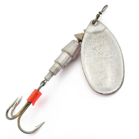 At a substantial 3/5 oz (16g), the weight of this USA-manufactured spinner indicates a design built for distance and depth. Measuring 3 1/2" (9cm), the blade carries a sharp 'MEPPS See Best' stamp, identifying a model specifically engineered for enhanced visibility. While the obverse side presents a clean silver finish, the reverse side holds a secret revealed in low light: a vibrant pink glow punctuated by two neon green spots. This luminescent theme extends to the treble hook, which is outfitted with a matching pink attractor sleeve. Rated at a 5/5, the specimen is in excellent shape, with the tiered metal body and wire components showing no signs of heavy use. Collectors tracking product code 17684 will appreciate how well the specialized glow paint has stayed bonded to the metal over the decades. The clevis allows the blade to hang freely, and the overall construction reflects the sturdy craftsmanship expected from vintage Mepps lures. Every stamped letter on the silver surface is legible, making the branding a prominent feature of this rare find.