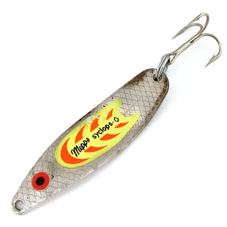 Sized for finesse at 2" (5 cm), the S-shaped profile of this spoon reflects its French engineering roots. This Mepps Syclops 0, carrying product code 15930, features a silver finish adorned with a bright yellow and orange scale-pattern sticker on its face. Stamped clearly on the reverse side is the "Made in France" origin alongside the 1/4 oz (8 g) weight designation. Anglers often choose this specific size for casting into smaller streams or targeting pressured fish in clear water. A distinct red eye is painted near the line tie, providing a high-contrast focal point against the textured metallic surface. The hardware consists of a sturdy split ring and a sharp treble hook, showing only minor surface wear. With a condition rating of 4/5, the lure maintains its original luster and shows signs of careful handling. The deep concave curve of the body allows for stability during both steady retrieves and vertical jigging techniques.