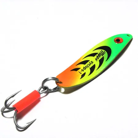 Fluorescent finishes on the 2 1/4" (6 cm) body of this spoon range from a vibrant chartreuse green near the eye to a deep orange at the tail. This specific Mepps Syclops 1, identified by product code 0309, features a distinctive series of black crescent accents printed along the side to mimic baitfish textures. Turning the 2/5 oz (12 g) lure over reveals a polished gold-toned reverse side, deeply stamped with the manufacturer's mark and "Made in France" origin. The hardware consists of a robust split ring connecting a sharp treble hook, which is further accented by a bright fluorescent orange sleeve on the shank. Designed for casting or trolling, the deeply curved profile is a classic example of French lure engineering from the Mepps factory. The specimen is in excellent condition, rated 5/5, showing the original luster on both the painted surface and the metal reverse.