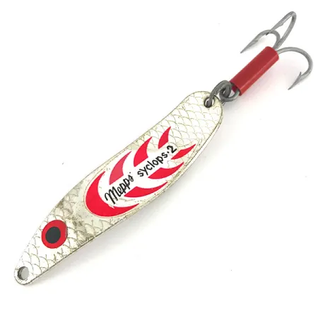 Found in a silver finish with a distinct scaly texture, this French-made casting spoon weighs in at 3/5 oz (17g). On the front face, a series of red flame-like accents wrap around the central text, complemented by a bold red and black eye motif near the line tie hole. Flipping the 3" (7.5 cm) body over reveals the classic stamping characteristic of authentic Mepps production, clearly marked with the brand name, weight, and "France" origin. The treble hook comes equipped with a bright red plastic attractor sleeve, a functional detail designed to provide a high-visibility focal point. This specimen remains in 5/5 condition, showing remarkably clean metallic surfaces and sharp, vibrant graphics. The double-contoured profile is the defining physical feature of the Syclops line, which is designed to reflect light across multiple planes while being cast or trolled. This specific item carries the product code 7697.