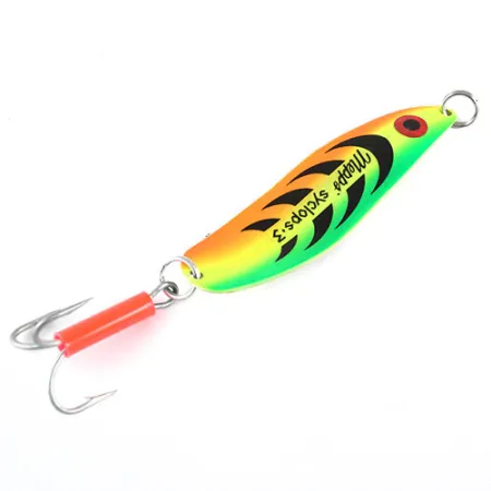 A vibrant Tiger pattern defines the face of this 3 1/2" (9cm) spoon, transitioning through shades of lime green, bright yellow, and deep orange. The Mepps Syclops 3, carrying Product Code 0997, features ten distinct black crescent marks along its S-shaped body, framing a bold red eye near the nose. Flipping it over reveals a polished brass back stamped with the manufacturer's name and its French origin. Weighing in at 1oz (26g), the heavy-gauge metal construction is paired with a split-ringed treble hook that includes a signature fluorescent red tube on the shank. This particular specimen is in top condition, rated at 5/5, with the paint and brass finish remaining exceptionally clean and bright.