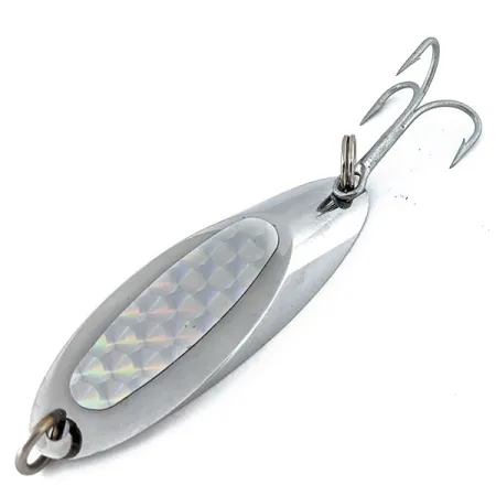 Measuring a substantial 2 3/4" (6.7cm) in length, the polished nickel finish on this American-made specimen reflects the quality standards of Weber’s mid-century production. This Mr Champ, cataloged as product code 13786, weighs in at a heavy 1 1/3 oz (40g), a density specifically designed for long-range casting or deep-water presentation. A standout feature is the silver holographic prism tape recessed into the center of the spoon, providing a multi-angled flash that contrasts against the smooth metal body. Rated in 5/5 condition, the hardware includes a large-gauge treble hook and thick split rings at both the nose and tail for secure rigging. While the Mr Champ was later produced by Luhr Jensen, this specific version represents the earlier era of Weber craftsmanship in the USA. The metal stamping is clean and well-defined, showcasing the classic oval profile that has remained a staple in tackle boxes for decades.
