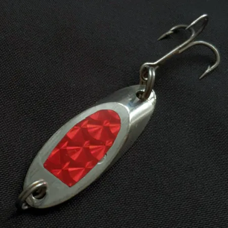 Weighing in at exactly 1/4 oz (7 g), this classic piece of American tackle history showcases the quality craftsmanship of Weber. Measuring 1 1/2" (4 cm) in length, the Mr Champ features a polished silver body centered with a vibrant red holographic insert. This prismatic sticker is detailed with a sharp diamond-pattern texture to maximize light reflection from various angles. The hardware is comprised of robust double-split rings at both ends, securely mounting a silver-tone treble hook. Labeled under product code 22145, this USA-made spoon is in 5/5 condition, showing a bright, well-maintained finish across its metal surfaces. The back side of the lure remains plain, high-polish silver, contrasting cleanly with the decorated front face.