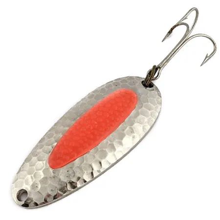Weighing in at 3/4oz (24g), the heavy-gauge brass body of this Nebco Pixee is built for substantial casting distance and stability in strong river currents. This specific model, listed under Product Code 18052, measures 2 1/2" (6.5cm) and features a Nickel/Red finish with a classic hammered surface. A central simulated salmon egg insert provides a visual strike point that reveals a bright orange luminescence when exposed to UV light. Produced by National Expert Bait (Nebco) before the label became part of the Blue Fox brand, this lure reflects a legacy of durable tackle designed for everything from saltwater breakers to deep freshwater pools. It comes equipped with a corrosion-resistant treble hook, suitable for targeting pike, salmon, and steelhead. Kept in a 5/5 condition, the nickel finish retains its original luster and the insert is perfectly intact. The spoon's weight and shape allow it to tumble naturally when fished on a slack line or a steady retrieve.