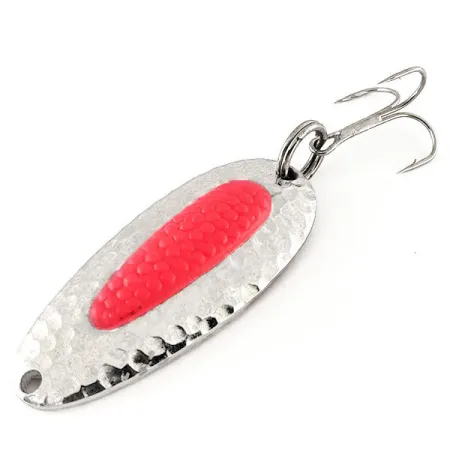 Hammered nickel textures on the body of this spoon catch light from every angle, making it a standout choice for deep-water and low-light conditions. Measuring 2 1/2" (6.5cm) and weighing 3/4oz (24g), the Nebco Pixee Spoon is constructed from heavy-gauge brass, providing the density needed for long-distance casting even into stiff coastal winds. This specific specimen, cataloged under Product Code 12362, is an original USA-made lure from the National Expert Bait Company, a brand that eventually became the legendary Blue Fox. The most distinctive feature is the red plastic insert, designed to simulate a salmon egg; on this UV model, that insert glows intensely under ultraviolet light, as demonstrated in the secondary photo. The lure is equipped with a sturdy split ring and a sharp treble hook, ready for targeting everything from steelhead and salmon to pike and saltwater species. It sits in a pristine 5/5 condition, with the reflective finish remaining bright and the insert securely fitted within the metal frame. Anglers often utilize these heavy spoons in strong river currents to reach deep pockets where fish congregate, or troll them in lakes at varying speeds. The weight and streamlined shape ensure it stays down in the water column during a steady retrieve.