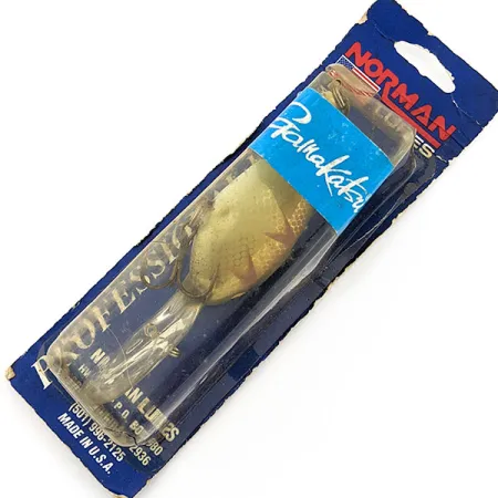 Brown scale patterns cover the body of this deep-diving crankbait, providing a realistic silhouette for targeting bass on deep ledges. Produced in the USA, this Norman DD14—identified by product code 19803—reaches depths between 11.8 ft and 13.8 ft (3.6 m – 4.2 m). The lure spans 2 3/4" (7cm) and weighs 3/5oz (17g), featuring a substantial diving bill that facilitates its deep-water reach. This particular specimen is unused, still sealed in the vintage blue Professional Series packaging. Note the blue Gamakatsu branding on the blister, indicating the high-quality hooks used by the manufacturer during this era. Designed as a rattle-equipped model, the lure is built for both casting and trolling techniques. The card back showcases several models from the lineup, highlighting the evolution of Norman’s deep-diving technology.