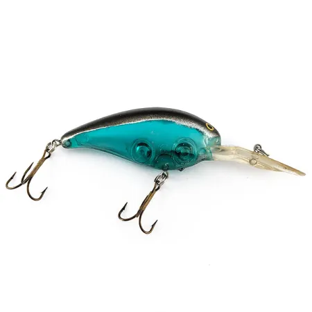 Translucent teal plastic forms the core of this deep-running crankbait, allowing a clear view of the two large internal rattle beads positioned within the belly. This Norman DD14, identified by product code 21252, is a classic tool for reaching depths between 11.8 ft (3.6 m) and 13.7 ft (4.2 m). Measuring 2 3/4" (7 cm) and weighing 3/5 oz (16 g), the lure features a dark charcoal back that transitions into shimmering silver along the upper flanks. Its elongated clear diving lip is built for both casting and trolling, providing the necessary leverage to stay deep during the retrieve. The hardware, consisting of two treble hooks, is in 4/5 condition, showing light, honest signs of age while remaining fully functional. Originating from the USA, the craftsmanship is visible in the clean seams and the specific placement of the rattle chamber for acoustic presence underwater.
