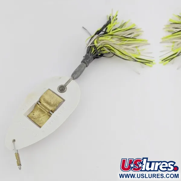 A white teardrop-shaped body characterizes this weedless spoon, measuring 3" (7.5 cm). The central cavity houses a hinged brass weight mechanism, a specific design element of the Weedwalker series intended to maintain stability. Fastened to the rear loop is a lead-head jig adorned with a silicone skirt in a white, yellow, and green pattern. Designed by Norman for navigating through dense surface vegetation, the broad underside allows the body to slide across lily pads and grass mats. Rated at 5/5 condition, the white finish remains bright and the brass components show no signs of dulling or age. This 2/3 oz (19 g) specimen, identified as Product Code 24495, features an upturned single hook integrated into the tail assembly to minimize fouling in thick cover.