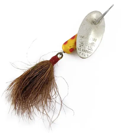 Weighing 3/16oz (4.5g), this Italian-made spinner represents the classic design that has been a mainstay in trout boxes for decades. The concave silver blade is stamped with the manufacturer's mark and 'ITALY', highlighting its origins from the original production lines. Its teardrop body is finished in a bright yellow with red polka dots, providing a high-contrast visual profile. A natural brown dressed hook, secured with a neat red thread wrap, adds bulk and a lifelike silhouette to the 2" (5cm) lure. This specific specimen, cataloged as product code 16962, is in 5/5 condition with a bright, clean blade and vibrant paint. The in-line blade design, where the shaft passes directly through the metal, allows for a tight rotation around the post. This construction makes it a reliable choice for technical casting in smaller streams where maintaining a specific depth and path is critical.