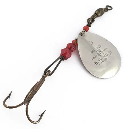Nickel and copper finishes meet on the teardrop-shaped Colorado blade of this vintage Pflueger Bear Valley spinner. Stamped with the size #3 and the classic bulldog trademark, the blade shows the clear craftsmanship of its USA origins. Measuring 3 1/4" (8 cm) in total length, the lure features three faceted red beads that act as both spacers and visual attractors along the wire shaft. This specimen, identified by product code 22963, weighs 3/16 oz (5 g) and maintains a condition rating of 5/5. A sturdy treble hook is attached to the rear, while the lead end is finished with a period-correct barrel swivel for line connection. The dual-tone plating on the blade provides a distinct contrast, typical of the high-quality hardware produced during this era of American tackle history.