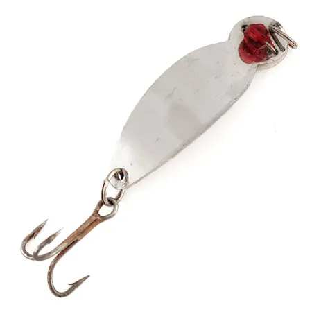 Stamped clearly on the back of this 1 3/4" (4.5cm) lure is the iconic 'POPEYE' name and the AL&W Tackle logo, markers of a classic American design. This specimen, identified by product code 12882, features a brilliant Nickel finish that remains remarkably bright and well-preserved. At a weight of 1/4oz (7g), the metal body carries a significant density for its size, a characteristic intended for casting precision. A standout feature is the vibrant red bead securely pinned at the head, acting as a striking visual focal point against the silver-toned body. The condition is a solid 5/5, showing a surface that has been exceptionally well cared for over the years. The hardware includes a sturdy treble hook attached via a split ring at the tail, completing the original construction of this AL&W Tackle piece.