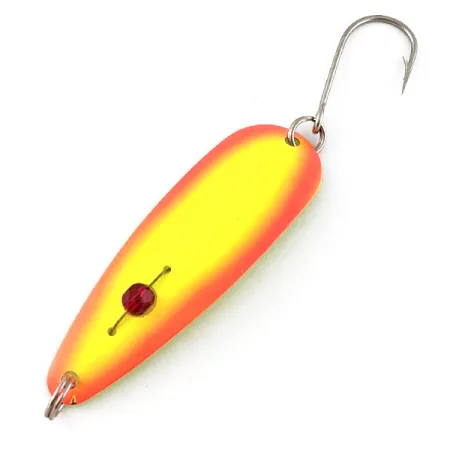 A vibrant yellow and orange gradient coats the face of this 3" (7.5cm) Red Eye Evil Eye spoon, a classic design originating from the USA. Weighing in at 3/16oz (6g), the lure carries the specific product code 23220 and features the manufacturer's iconic red glass bead set into the center of the metal blade. The reverse side is finished in a solid, high-visibility chartreuse, providing a sharp contrast to the warmer tones on the front. Hardware includes a single, large-gap hook secured by a split ring, which is a common configuration for reducing snags while maintaining a solid hookset. This specimen maintains an excellent appearance with a condition rating of 5/5, showing a well-preserved finish and clean metal surfaces throughout.